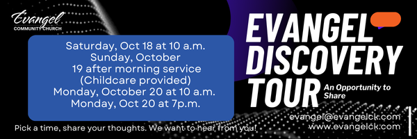 Please fill out this form and click submit. Pick which time slot works for you. All meetings will be held at Evangel. Participants will be split into groups where questions will be asked. You will get to share your thoughts and opinions on those questions. There will be a group facilitator asking the questions and an group scribe writing down answers that are given. We want to hear from you. This is your opportunity to share your thoughts regarding Evangel.